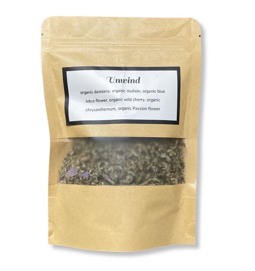 Organic damiana, organic mullein, organic blue lotus flower, organic wild cherry, organic chrysanthemum, organic passionflower.
